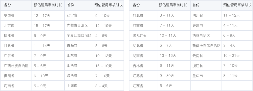各個(gè)省管局預(yù)計(jì)審核時(shí)長(zhǎng),實(shí)際審核時(shí)長(zhǎng)會(huì)根據(jù)備案場(chǎng)景有所不同,下表格僅供參考。詳情可查看 詳細(xì)規(guī)則。